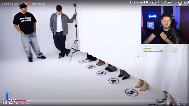 00:09:29Es wird ein Blind Date Format mit Kevin von Trash TV präsentiert, der bereits bei Date of Fake zu sehen war, wo er Aileen gegenüber saß. Es gab eine kurze Kennenlernphase, die in einem TikTok-Beef endete. Kevin spielt Fußball und ist Single. Sechs Mädels stehen hinter einem Vorhang bereit. Es wird nach den Schuhen gefragt, die am besten gefallen. Die erste Frage an die Kandidatinnen ist nach Name, Alter, Bodycount und der Partei, die sie wählen würden, wenn am Sonntag Bundestagswahl wäre. Die Antworten der Kandidatinnen bezüglich ihrer Parteiwahl werden kommentiert. Es wird festgestellt, dass viele der Frauen die Linke wählen würden. Die Frage nach dem Bodycount wird als nicht so wichtig erachtet. Es wird die Frage gestellt, ob es stören würde, wenn die Partnerin/der Partner eine gegenteilige Partei wählt. Die nächste Frage ist, ob die Kandidatinnen/Kandidaten mit ins Trash-TV gehen würden.