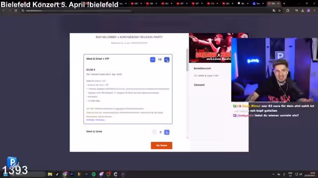 00:05:18Der Streamer freut sich, nach seiner Krankheitspause wieder da zu sein, und stellt fest, dass er an einem Tag mit Fieber mehr macht als in fünf Monaten normal. Er kündigt seine Show in Bielefeld an, die für den 5. April geplant ist. Bereits wurden Tickets verkauft, wobei überraschenderweise hauptsächlich die teuersten Optionen nachgefragt werden, was er als respektabel empfindet. Der Ticketverkauf verläuft sehr gut, fast ausverkauft für die VIP-Kategorie.