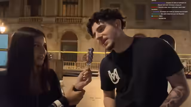 00:05:09Der Streamer spricht einen Passanten an, der sich als Mark vorstellt. Mark stammt aus Toronto und stellt Fragen zu Plattformen wie Twitch und der Zuschauerzahl. Dabei geht es um Verwandtschaftsverhältnisse, das Austauschen von persönlichen Geschichten und die Kalorien eines Hundes. Ein Diskurs über die Schönheit einer Begleiterin namens Angie wird angekündigt, der noch nicht zu Ende geführt wird. Es entsteht ein lockeres, persönliches Gespräch zwischen den Anwesenden.