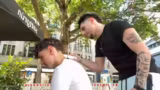 00:02:48Nach längerem Warten trifft der erste Kunde, Gianluca, ein. Der Streamer erklärt ihm, dass er verschiedene Schnitttechniken anbieten kann, jedoch keine speziellen Frauenfrisuren. Die beiden suchen eine Sitzgelegenheit, finden schließlich einen Platz und beginnen mit dem Schnitt. Der Streamer arbeitet mit einer Haarschneidemaschine und beginnt, einen Taper zu schneiden, während die Zuschauer im Chat den Fortschritt kommentieren.