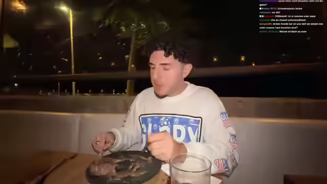 00:43:41Der Streamer macht einen Witz und Angie nimmt ihn ernst, woraufhin er erklärt, dass sie seinen Humor nicht versteht. Sie bekommen Hummus und Brot serviert. Der Streamer fragt, ob es lecker ist und Angie isst fast die ganze Soße mit nur einem Brötchen. Sie kommentieren, dass das Essen gut ist und dass sie Sachen bekommen, die sie nicht bestellt haben. Der Streamer fordert den Chat auf, nicht fies zu sein. Es wird über die Wirkung von Sativa und Indica diskutiert. Der Streamer erklärt, dass er seit neun oder zehn Tagen nicht geraucht hat, aber im Urlaub in Barcelona wieder damit angefangen hat. Er scherzt darüber, dass er ausgelaugt und zugedröhnt aussieht. Der Streamer fragt, ob er wirklich schwul ist und Angie wird gefragt, ob sie eine feminine Frau ist. Es wird darüber diskutiert, warum der Streamer Cola bestellt hat. Der Streamer fragt Angie, ob sie ein Jahr Knast oder ein Jahr Rack wählen würde. Er liest einen Kommentar vor, der für ihn unangenehm ist und bittet darum, ihn nicht noch einmal vorzulesen.