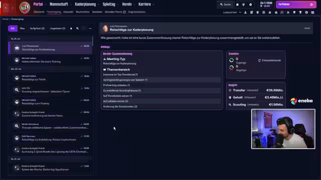 01:50:49Ausführlich wird die Transferstrategie besprochen. Mit 30 Millionen Euro Budget auf dem Konto plant der Streamer, die Gehälter der Spieler anzuheben und den Kader zu verstärken. Bereits vier Transfers sind gesichert, darunter Thor-Kilzen aus der eigenen Liga. Diskutiert werden weitere Veränderungen, insbesondere auf der Torwartposition. Ein neuer Keeper ist bereits verpflichtet, kann aber erst in den Playoffs eingesetzt werden. Die aktuelle Leistung des Teams wird kritisch hinterfragt.