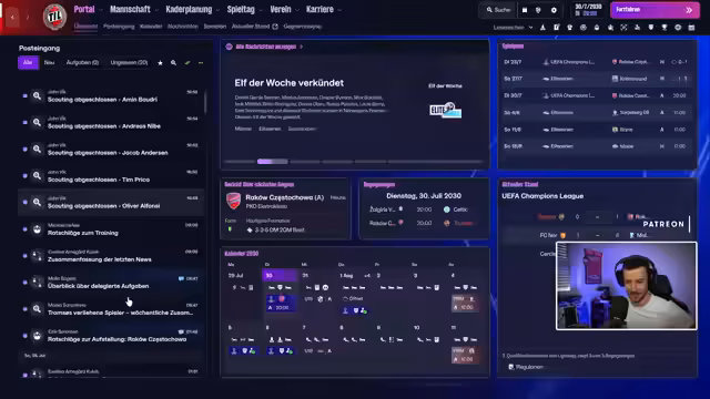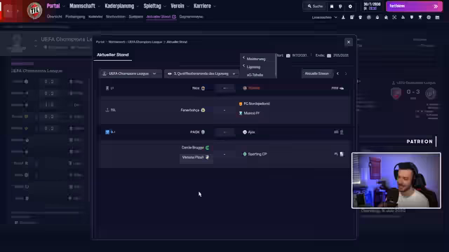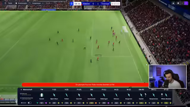 00:39:08Das FM26-Spiel gegen Lillestrøm beginnt mit einem Aufbau über den rechten Flügel. Trotz Ballbesitz und Chancen endet die erste Halbzeit torlos. Der Streamer analysiert die Defensive und kündigt Rotationen für die zweite Hälfte an. Parallelen zur realen Champions League-Qualifikation werden gezogen, während die Weihnachtsdekoration im Hintergrund sichtbar ist.