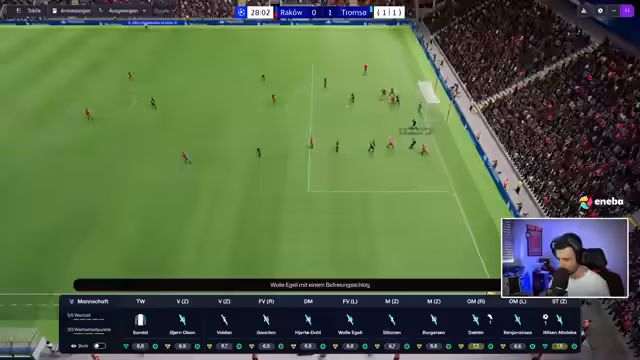 01:18:21Die Wette für das Champions League-Rückspiel gegen Raków wird aktiv platziert. Das FM26-Spiel läuft weiter mit Fokus auf Offensivstrategie. Der Streamer diskutiert Personalien (z.B. Björn Olsen aus der Jugend) und kritisiert die aktuelle Form ohne Tore. Technische Aspekte des FM26-Updates (Stadien-Patch) werden kurz angesprochen.