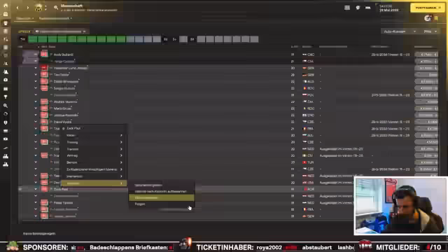 02:56:41Der Streamer widmet sich der Organisation des Kaders, indem er die individuellen Trainingsziele für jeden Spieler festlegt. Diese Aufgabe stellt sich als aufwändig heraus. Zugleich nutzt er die Gelegenheit, den Start des neuen FM-Projektes auf YouTube um 13 Uhr erneut zu bewerben und die Zuschauer zur Teilnahme einzuladen.