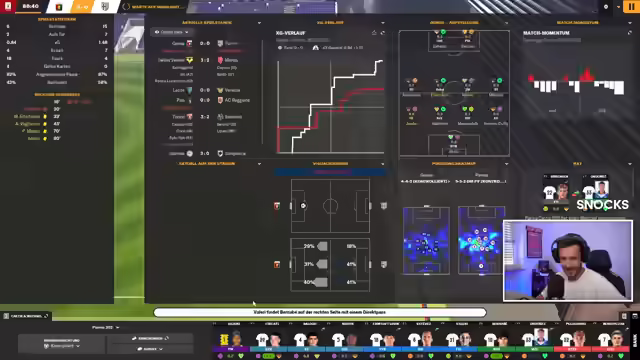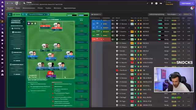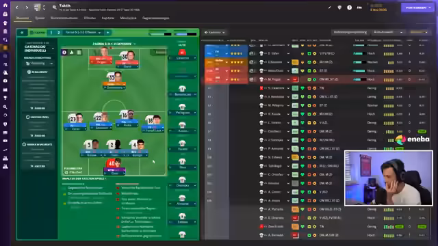 01:33:08Es werden verschiedene taktische Formationen diskutiert, darunter 3-3-2-1, die jedoch als zu offensiv angesehen wird. Holziges Holz schlägt eine Formation mit einem ZM auf Angreifen, einem ZM auf Unterstützen und einem zurückgezogenen Spielmacher auf Verteidigen vor, sowie Halbraumverteidiger auf Unterstützen in der Innenverteidigung. Der Streamer äußert Bedenken bezüglich eines Liberos auf Unterstützen, da dieser im Spielaufbau nach vorne geht. Es wird überlegt, ob ein normaler IFA in Kombination mit einem zurückgezogenen Spielmacher sinnvoller wäre. Der YouTube-Kanal 'Fletch the Source' wird für seine Analysen verschiedener Formationen empfohlen. Es wird die Frage aufgeworfen, ob ein vorgeschobener Spielmacher gut funktioniert und die Bank kurzzeitig ausgeblendet. Halbraumverteidiger verteidigen, Flügelverteidiger auf Unterstützen, Mitspieler Torhaut auf Angreifen und DM auf Unterstützen werden als mögliche Optionen genannt. Es wird überlegt, Cater auf die 10 zu positionieren, da er auf der 6 seiner Qualitäten beraubt würde. Im Mittelfeld gibt es viele ausgeglichene Spieler. Nani wird nicht mehr eingeplant, stattdessen wird Cater eingesetzt. Es wird betont, dass man derzeit nicht mit der kompletten Elf planen kann, da viele Spieler verletzt sind.