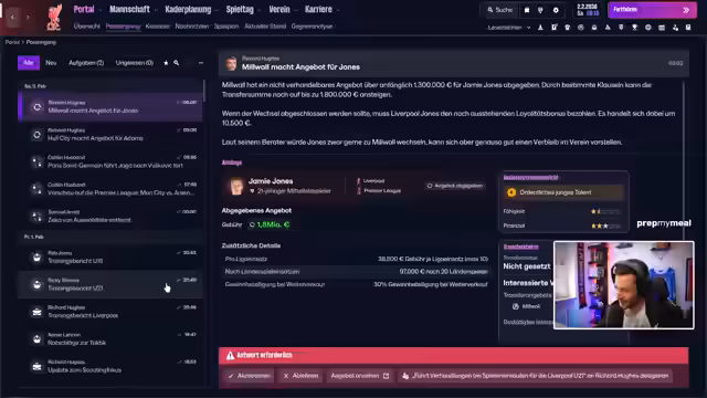 02:49:56Der Streamer bespricht verschiedene Spieler, darunter Joao Neves, Florian Wirtz und andere, die er in seinem Team hat. Er äußert sich über die Verletzungssituation und betont die Notwendigkeit, clever zu agieren. Gleichzeitig geht er auf Scouting-Aktivitäten ein, bei denen er nach Talenten sucht, wie etwa einen belgischen Spieler von Beveren. Er erwähnt auch seine Bemühungen, die Scouts zu instruieren und Empfehlungen zu sammeln, um das Team zu stärken.