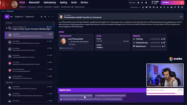 02:27:02Die lange Vorbereitungszeit bietet die Möglichkeit, die Mitarbeiterstruktur des Vereins zu optimieren. Der Streamer plant, einen neuen Scout einzustellen und die Aufgaben der Assistenztrainer neu zu verteilen, um für jede Rubrik einen Experten zu haben. Namen wie Lutz Pfannenstiel und Alfons Higgel werden als potenzielle Kandidaten für die Positionen des Sportdirektors und Scouts diskutiert. Lutz Pfannenstiel wird aufgrund seiner Erfahrung als „Globetrotter“ und seiner Vergangenheit als Sportdirektor bei St. Louis City als interessante Option angesehen. Die Schwierigkeit, geeignete Mitarbeiter zu finden, die bereit sind, nach Tromsø zu ziehen, wird ebenfalls thematisiert. Schließlich wird André Aes als neuer Assistenztrainer eingestellt. Die Testspiele werden genutzt, um Rotationsspielern und jungen Talenten Spielpraxis zu geben, um sie auf die kommende Saison vorzubereiten. Die Freude über den Gewinn des nationalen Pokals in der ersten Saison ist groß, und es wird betont, dass dies ein historischer Tag für den Verein ist.