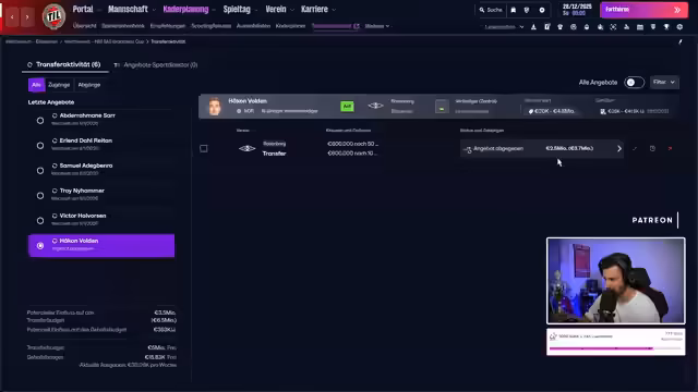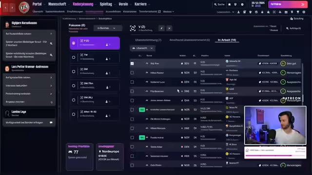 02:04:45Der Streamer befasst sich intensiv mit der Kaderplanung, insbesondere mit der Rolle von Korneg als Stammspieler und der potenziellen Umwandlung von Hüttergard zum Rotationsspieler. Es wird über einen möglichen Transfer von Lukas Gaustal diskutiert, der ablösefrei wäre, und ein Angebot für ihn in Betracht gezogen. Die Fernsehgelder bringen eine halbe Million Euro ein, was die finanzielle Situation des Vereins verbessert. Des Weiteren werden Testspiele arrangiert, darunter ein lokales Match gegen Skarp und internationale Begegnungen gegen Panathinaikos und Klaksvík, um die Mannschaft auf die kommende Saison vorzubereiten. Ein Mittelfeldspieler wird für 925.000 Euro verkauft, was als „brutaler Deal“ bezeichnet wird. Die Verhandlungen über Ratenzahlungen und sofortige Auszahlungen werden thematisiert, wobei der Streamer versucht, die bestmöglichen Konditionen für den Verein zu erzielen. Die Suche nach neuen Spielern, die sowohl talentiert als auch finanziell machbar sind, erweist sich als schwierig, da das Budget begrenzt ist.