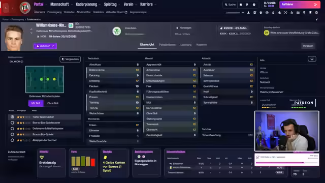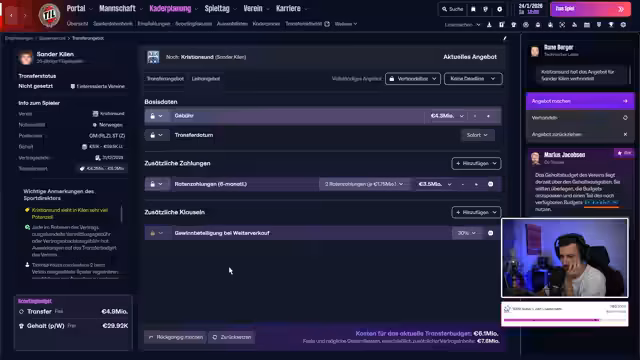 02:17:00Die Diskussion über die finanziellen Aspekte des Vereins setzt sich fort, insbesondere die Auswirkungen von Ratenzahlungen und Sofortauszahlungen bei Spielertransfers. Der Streamer ist unsicher über die genauen Einnahmen, die durch eine geringere Sofortzahlung anstelle von Raten erzielt werden. Es wird erwähnt, dass der Verein als nördlichster Profiverein Europas besondere Herausforderungen bei der Reiseplanung hat. Der Spielplan für die kommende Saison wird vorgestellt, mit einem schwierigen Auftakt gegen den norwegischen Meister Bodø/Glimt. Der Streamer äußert sich frustriert über die lange Vorbereitungszeit und die Notwendigkeit, viele Spiele zu simulieren. Die Suche nach Partnervereinen und Trainingslagern wird thematisiert, wobei der Vorstand eine Anfrage für ein Trainingslager aufgrund schlechter Ergebnisse ablehnt. Die Möglichkeit, einen Spieler wie Garmusch, der einen neuen Vertrag fordert, trotz hoher Gehaltsforderungen zu halten, wird abgewogen.