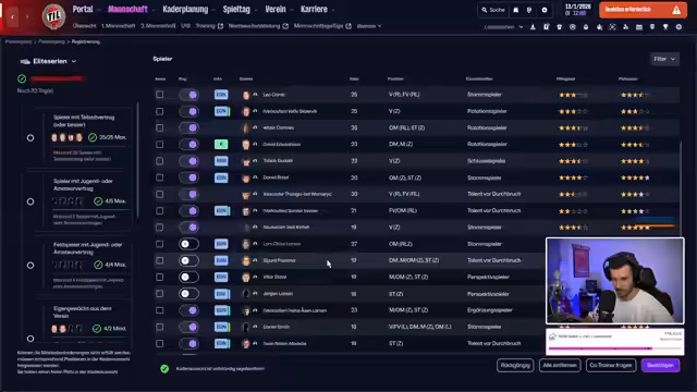 01:12:07Nach zwei Pokalsiegen im Jahr 2026 wird die Kaderplanung intensiviert. Spieler wie Koskela, ein Finne, der verliehen war, sollen verliehen werden, um den Kader zu optimieren. Es wird überlegt, welche Spieler für die Europa League Qualifikation geeignet sind, wobei die Anpassung an kalte Temperaturen für südamerikanische Spieler eine Herausforderung darstellen könnte. Ein unerwarteter Keeper taucht im Kader auf, dessen Herkunft unklar ist. Ein neues Update für das Spiel wird angekündigt und dessen Installation über die Steam-Beta erklärt. Das Update behebt über 200 Fehler, verbessert das Gameplay und die Benutzeroberfläche und ermöglicht die Navigation durch Nachrichten mittels Leertaste. Die Community diskutiert die Auswirkungen des Updates auf das Spielgeschehen und die Kaderzusammenstellung. Die Saisonziele, wie das Erreichen des Viertelfinales im Crossover Cup und Brathindel Cup sowie eine Platzierung in der oberen Tabellenhälfte, werden festgelegt. Die Suche nach neuen Talenten und die Optimierung der Spielerzufriedenheit durch angepasste Einsatzzeiten stehen im Fokus.