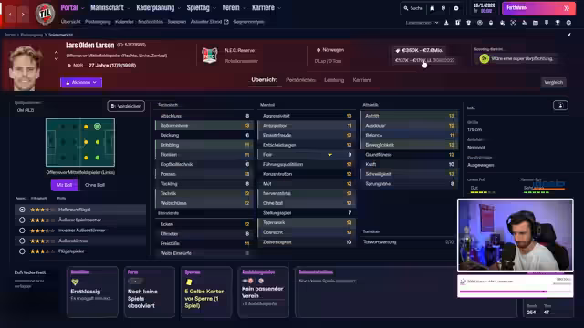 00:41:13Jens Jerte Dahl ist für 7 bis 8 Millionen Euro zu PSG gewechselt, nachdem er sein ganzes Leben lang für Tromsø gespielt und im letzten Spiel den Pokalsieg gefeiert hat. Der Streamer bedauert, dass Börsett, Mikkelsen und Larsen, die wichtige Rollen spielten, nur ausgeliehen waren und zum jeweiligen Verein zurückkehren werden. Er zeigt sein Football-Manager-Heftchen, in dem er Notizen zur Kaderplanung macht. Das Team benötigt noch einen dritten Torwart, zwei Innenverteidiger, zwei Sechser (einer davon eher defensiv ausgerichtet) und drei Flügelspieler. Er erwähnt, dass er ein Angebot für Harkon Wolden zurückgezogen hat, da der Spieler zu teuer wäre. Er plant Testspiele gegen Sogndal, Lillestrøm und Molde, um die Mannschaft auf die kommende Saison vorzubereiten. Es wird diskutiert, wann die Mannschaft wieder ins Training einsteigt, und es stellt sich heraus, dass dies am 12. Januar der Fall ist.