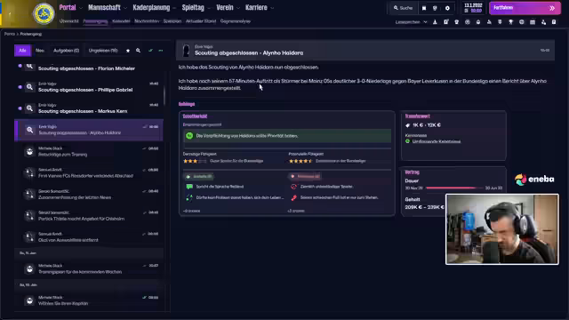00:20:09Der Fokus liegt auf dem Football Manager-Team SC Alter. Nach einem starken November ohne Gegentor folgte im Dezember eine Niederlage. Obwohl der Verein im Mittelfeld der Tabelle steht, freut sich der Streamer über bevorstehende Neuzugänge wie Jakob Sachse und Ayub Chaykun. Die Transferaktivitäten und die taktische Ausrichtung der Mannschaft, insbesondere das 4-4-2-System mit Ballbesitz, werden im Detail besprochen.