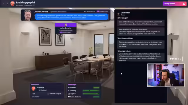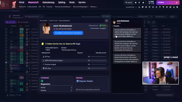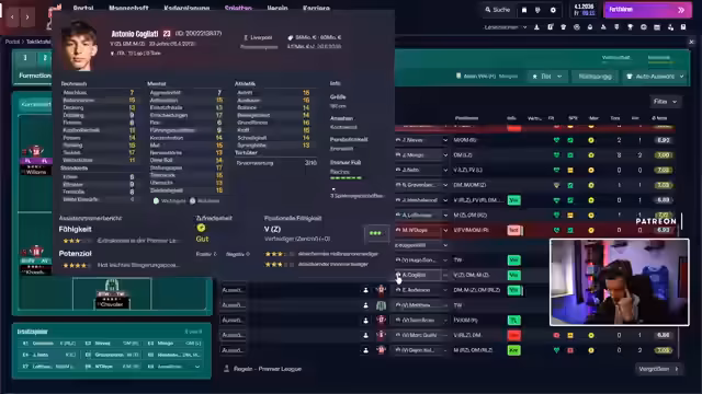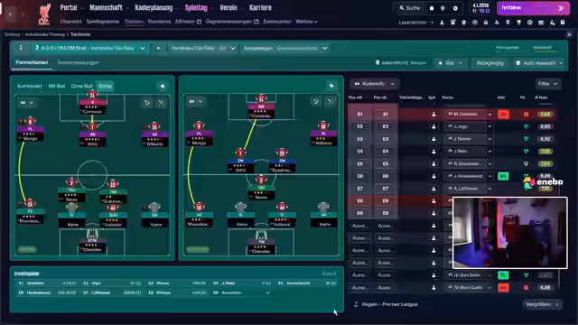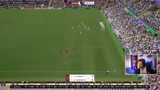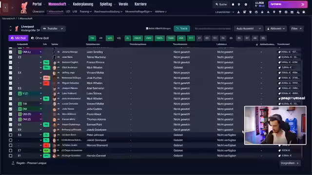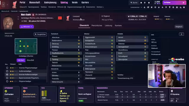 02:25:08An seinem neuen Arbeitsplatz an der Anfield Road beginnt der Streamer mit der Neuorganisation des Trainerstabs. Übernimmt selbst die Verantwortung für Führungspersonal, Analyse, Taktik und Spieltag, delegiert andere Aufgaben. Eine erste finanzielle Bilanz zeigt ein Minus von 50 Millionen auf dem Konto, aber ein ausreichendes Transfer- und Gehaltsbudget. Die Analyse des Kaders zeigt Stärken auf den Flügeln, aber auch einen akuten Bedarf im Innenverteidigerbereich.