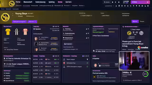 00:14:22Nach einem kurzen Rückblick auf die letzte Saison startet der Streamer offiziell in die neue Saison des FM-Save "Journeyman". Nach erfolgreichen Playoffs gegen Rascard und Winterthur ist die Champions-League-Gruppenphase erreicht. Der Fokus liegt auf den Transferaktivitäten: Der Kader wurde um Neuzugänge wie Jovica Petkovic, Simon Zanchi und Matthias Velazquez verstärkt. Die Transferbilanz liegt bei rund 44,5 Millionen Euro. Wichtig ist ein neuer Linksverteidiger, um für die Champions League gerüstet zu sein.