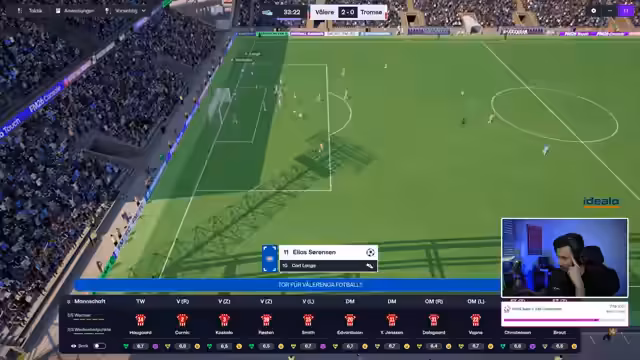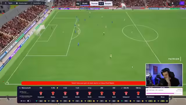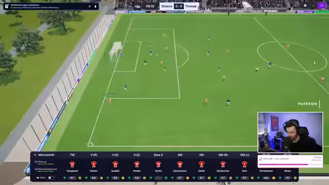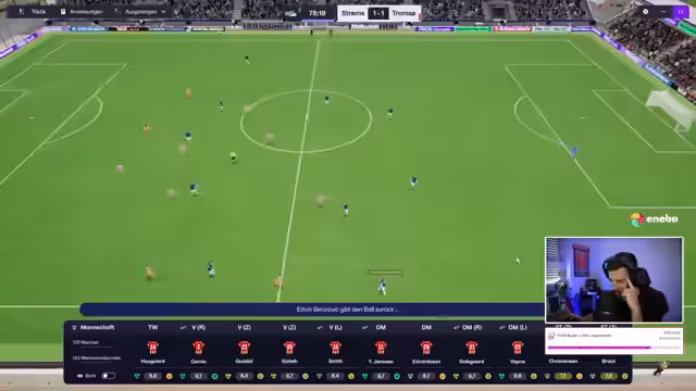 05:16:39Das nächste Spiel beginnt im Schneefall, und Tromsø muss schnellstmöglich eine weitere Niederlagenserie verhindern. Der Streamer fragt humorvoll nach internationalen Connections für Karten zum Bernabeu-Stadion, was im Chat für Belustigung sorgt. Haugard befindet sich in einer Krise und spielt unter seinen Möglichkeiten. Trotzdem gelingt Daniel Braut der Ausgleich zum 1:1. Im Chat wird über das Champions-League-Finale zwischen Leverkusen und Leipzig diskutiert, wobei die Zuschauer aufgefordert werden, sich zu entscheiden, wem sie die Daumen drücken möchten. Der Streamer überlegt, im Spiel auf Ballbesitz zu setzen und die Anweisungen entsprechend anzupassen. Ein Zuschauer verabschiedet sich, um an die frische Luft zu gehen, was der Streamer ebenfalls plant.