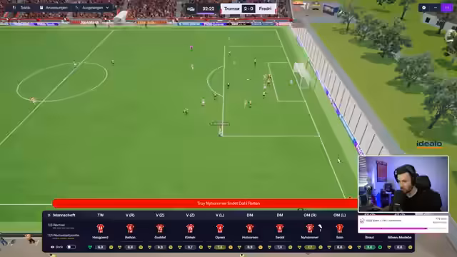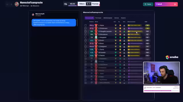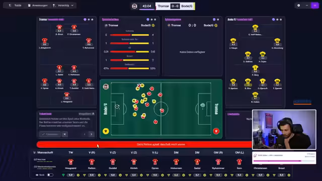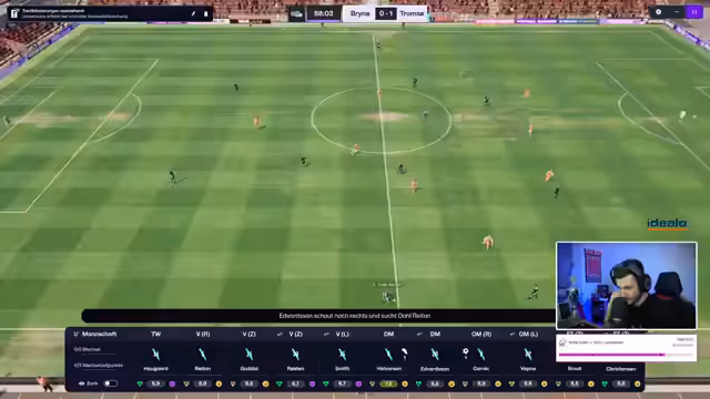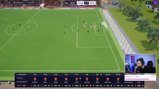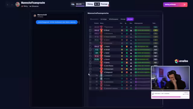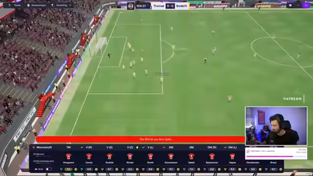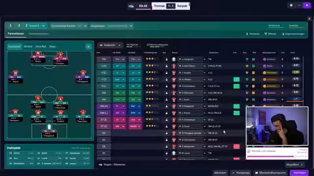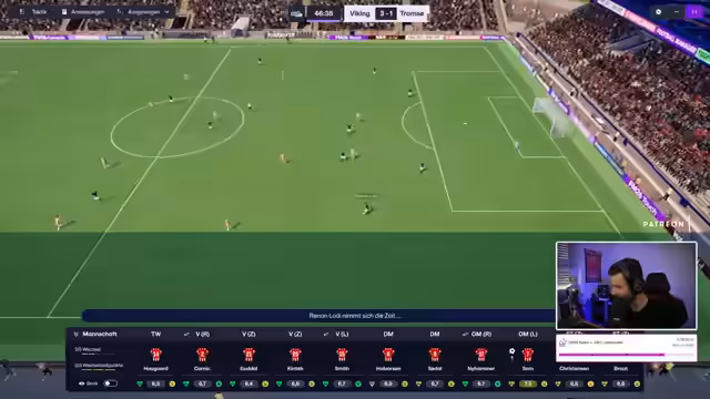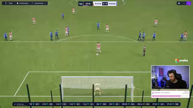04:47:04Das Ligaspiel gegen Viking entwickelt sich turbulent. Nach einem frühen Rückstand gelingt Samuel Adek Benro der Ausgleich zum 1:1, was für Selbstvertrauen sorgt. Doch kurz darauf gerät Tromsø erneut in Rückstand (2:1). Der Streamer nimmt humorvoll Bezug auf die Niederlage gegen Bielefeld und die fehlende spielerische Qualität des KSC. Es wird über den möglichen Verkauf von Kintee nachgedacht, um die bestmögliche Ablösesumme zu erzielen und einen Nachfolger zu etablieren. Zur Halbzeit nimmt der Streamer drastische Änderungen vor, mit einem Dreifachwechsel und der Umstellung auf Ballbesitzspiel, um das Spiel zu drehen. Die Manager-Story eines Zuschauers auf Discord wird positiv hervorgehoben und zur Lektüre empfohlen.