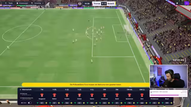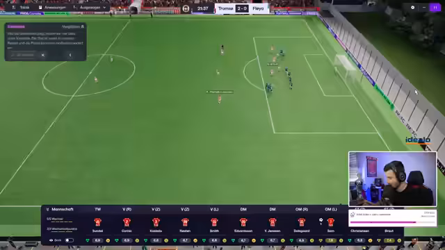 01:21:28Der Streamer liebt seine Kaderzusammenstellung, steht aber vor dem Problem, dass er aufgrund fehlender fitter rechter Verteidiger nicht von der Fünferkette abweichen kann. Christiansen, ein älterer Spieler, wird in die Mannschaft geholt. Das Auswärtsspiel gegen Strömsgodset wird vorsichtig angegangen, da der Gegner zu Hause spielt. Es wird ein frischer Kaffee zubereitet, der für den Streamer eine ähnliche Bedeutung hat wie die Frikadelle am Freitag für andere. Das Spiel gegen Strömsgodset beginnt, und Oprea ist angeschlagen. Der Streamer äußert den Wunsch nach einem Kaffeepartner für seinen Stream, da dies perfekt zu ihm passen würde. Er hat bereits mehrere Kaffeeröstereien kontaktiert, aber bisher ohne Erfolg. Eine Twitch-Prime-Werbung wird eingespielt, und der Streamer erklärt, wie Zuschauer ihn kostenlos abonnieren können.
