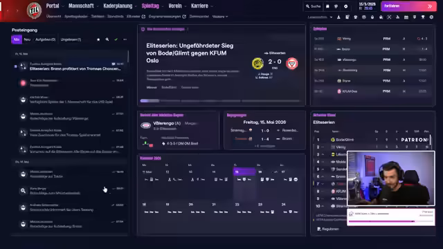 00:12:37Der Stream beginnt am Freitagmorgen, dem 14. November 2025, um 10:13 Uhr. Der Streamer begrüßt seine Zuschauer aus dem kalten, aber gemütlichen Tromsø in Norwegen. Er erwähnt, dass er müde ist, da er die Nacht zuvor in einem 'Football Heritage Loophole' auf Instagram und YouTube verbracht hat, wo er sich Videos von der Copa Libertadores, dem Superclásico und Francesco Tottis schönsten Toren und Abschiedsspielen ansah. Normalerweise geht er spätestens um Mitternacht schlafen, im Durchschnitt eher gegen 23:00 Uhr, aber diese Nacht war eine Ausnahme. Er kündigt an, dass er heute einen langen Stream haben wird und auch am Samstag und Sonntag live sein wird, um die Zuschauer mit Football Manager Content zu versorgen, obwohl an diesem Wochenende kein Vereinsfußball stattfindet. Montag und Dienstag ist er nicht da, aber am Mittwochmorgen ist er wieder live. Die kommende Woche ist vollgepackt mit Terminen, darunter ein geheimes Projekt in Regensburg am Donnerstag und ein Besuch bei Timo und seiner Tochter am Freitagabend.