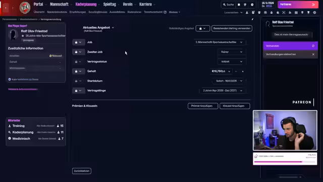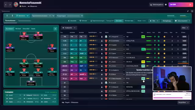 02:10:06Der Streamer muss sich nun um Mikro-Management-Themen kümmern. Er fragt den Chat, ob sie heute den Wienerle-Tag machen wollen, da er wieder Wienerle gekauft hat und sich im Wienerle-Hype befindet. Es wird über Abstürze im Spiel gesprochen, die der Streamer nicht mehr hat. Es wird überlegt, ob man beim Essen einen Vlog oder eine Muttermilch-Doku schauen soll. Der Streamer überprüft die Mitarbeiter im Verein, insbesondere die Leistungsanalysten für die Reserve- und Jugendmannschaften. Er stellt fest, dass es schwierig ist, qualifiziertes Personal zu finden, insbesondere Norweger. Er scherzt über die Gehaltsforderungen einer ausgewählten Frau. Ein Sportwissenschaftler wird gesucht, und es wird beschlossen, einen schlechten Norweger einzustellen, falls kein besserer verfügbar ist. Der Streamer plant, bis in den späten Nachmittag oder frühen Abend zu streamen. Die Länderspielpause wird genutzt, um Highlights anzuschauen. Der Streamer überprüft die U23-Norweger mit auslaufenden Verträgen, um potenzielle Neuzugänge zu finden.