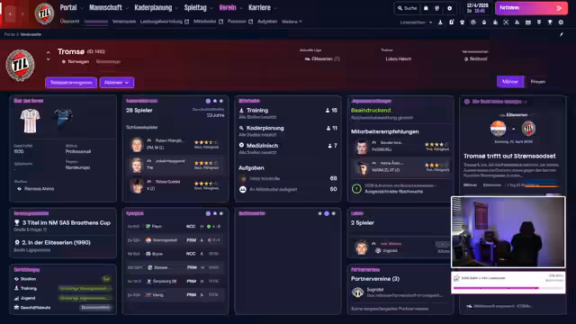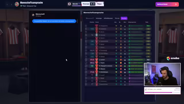 03:30:39Nach der Dokumentation kehrt der Stream zum Spiel gegen Sarpsborg zurück, das aufgrund des Absturzes erneut gestartet wird. Die Mannschaft spielt weiterhin in unveränderter Formation und kann das Spiel mit 2:1 gewinnen, wodurch die Ungeschlagenheit in der Liga fortgesetzt wird. Anschließend bereitet sich das Team auf das Pokalfinale des Crossover Cups gegen Bodo Glimt vor, einem wichtigen Spiel um die Vorherrschaft in Nordnorwegen. Der Sieger erhält ein Preisgeld von 250.000, während der Verlierer 126.000 erhält. Ziel ist es, den zweiten nationalen Titel zu gewinnen und Tromsø zu einem Top-Team zu entwickeln. Es werden auch Anpassungen im Scouting-Fokus vorgenommen, um junge Talente aus der zweiten und dritten norwegischen Liga zu finden. Die finanzielle Lage des Vereins wird als angespannt beschrieben, obwohl noch Budget vorhanden ist. Das Pokalfinale wird mit einer emotionalen Ansprache und dem Song 'Heart of Courage' eingeläutet, um die Mannschaft zu motivieren.