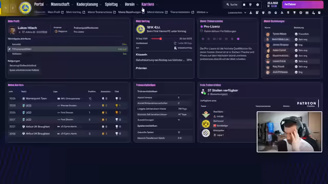 01:05:35Aufgrund der verpassten Qualifikation und des geringen Budgets beim Verein (0 Euro Transferbudget) wird die Wechselphase in die Karriere angetreten. Der Streamer kündigt an, sich als Trainer bei namhaften Vereinen wie Ajax, Celtic und Braga zu bewerben, die einen Trainer suchen und den Qualitätsansprüchen der Journey genügen.