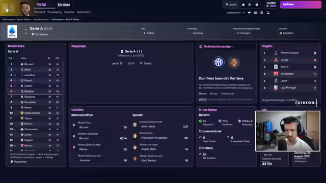 01:12:29Nach der Wechselphase präsentiert der Streamer die Ergebnisse der Football-Manager-Simulationen. Als große Überraschung gewinnt Eintracht Frankfurt die deutsche Meisterschaft. Parallel dazu werden die europäischen Wettbewerbsergebnisse (Champions League, Europa League) präsentiert und kommentiert.
