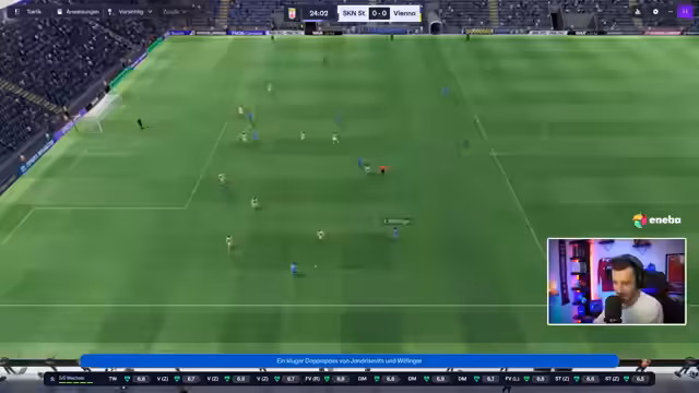 01:25:36Für das Spiel gegen Blau-Weiß-Linz wird eine ausgewogene Taktik angewandt, um den Ball zu besitzen und defensiv stabil zu stehen. Ein zentrales Problem wird deutlich: Der defensive Sechser Demarco weist schwache Defensivattribute auf und wird als Schwachpunkt im Kader identifiziert. Gleichzeitig taucht ein Transferanliegen auf, als der junge Spieler Kitz das Verlangen äußert, für einen größeren Verein spielen zu wollen, was zum Nachdenken über Transferstrategien zwingt.