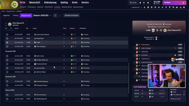 02:42:49Die laufenden Verträge bei dem Verein laufen aus und müssen geklärt werden, wobei ein Freund-Transfer als Gewinn verbucht wird. Der Streamer kommentiert aktuelle Spiele wie Magdeburg gegen Darmstadt (1,22 zu 0,11 XG für Magdeburg) und das bevorstehende Spiel gegen Sankt Pölten mit Trainer Robert Klaus. Die Leistungen von Spielern wie Robert Klaus und der positive Effekt eines neuen Coaches bei Sankt Pölten werden erwähnt. Zudem wird die Situation bei Ulm kommentiert, wo der Traum des Ulmer-Spatzen vorbei ist und der Verein absteigt.