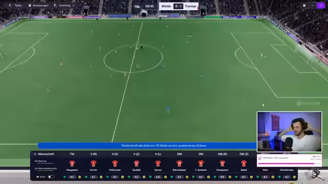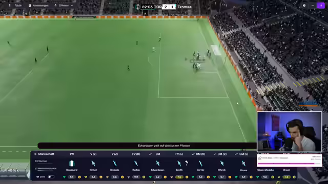 02:55:42Das Conference-League-Spiel beginnt mit einem Eigentor für Tromsø, doch die Mannschaft kämpft sich zurück. Durch einen starken Spielzug von Nyhammer und Smith gelingt in der 85. Minute der Ausgleich und wenig später sogar der Siegtreffer. Der Streamer ist überwältigt von der dramatischen Wende und dem ersten Sieg eines norwegischen Vereins in dieser Conference-League-Saison. Der Sieg ist psychologisch wichtig und gibt einen positiven Impuls für das anstehende Ligaspiel, das um einen Platz in der Europa League geht. Nach dem Sieg werden Wechsel vorgenommen, um die Kräfte zu schonen.