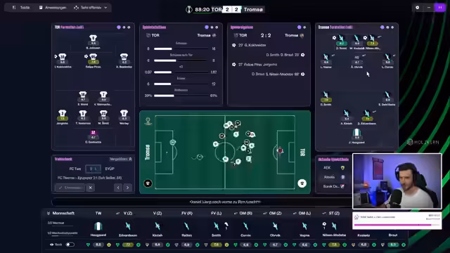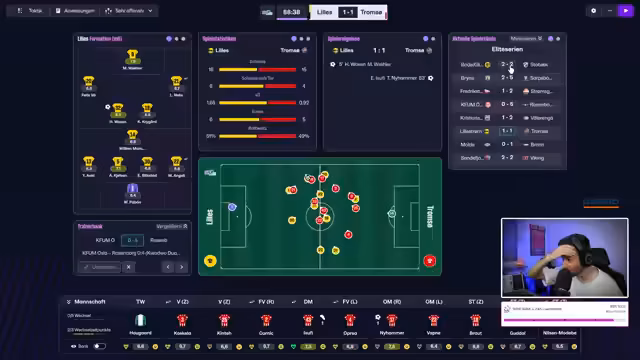 01:37:02Nach einer taktischen Anweisung an den jungen Spieler Orwig, vertikalere und risikoreichere Pässe zu spielen, erzielt Braut ein Tor durch eine hervorragende Vorlage von Orwig. Dieses Zusammenspiel wird als 'überragendst' gefeiert und unterstreicht den Erfolg der Trainerentscheidung. In der Tabelle belegt Tromsø aktuell den dritten Rang, punktgleich mit Obode und Molde, was auf ein spannendes Saisonfinale hindeutet. Die Bedeutung von Orwigs Vorlage wird hervorgehoben, obwohl die Anzeige 'keine Vorlage' anzeigt, was als kleiner Fehler im Spiel interpretiert wird. Der Streamer lobt die Leistung der Mannschaft und die Wirkung der taktischen Änderungen, die zu diesem wichtigen Tor geführt haben.