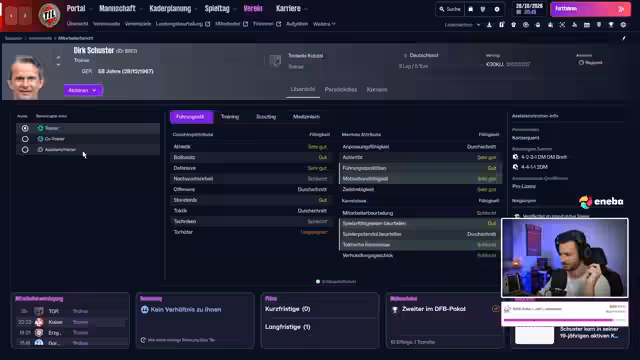 00:25:53Der Streamer kündigt eine wichtige Personalveränderung an und verpflichtet den norwegischen Innenverteidiger Carsten Ekornes für vier Millionen Euro. Obwohl er nur eine Bewertung von 86 hat, wird er aufgrund seiner jungen von 20 Jahren und guten Werten, insbesondere einer Sprunghöhe von 16, als spannende Investition gesehen. Es wird erwähnt, dass er zum Topverdiener des Vereins avancieren wird. Der Transfer stellt auch einen Vorgriff auf die Zukunft dar, da der Streamer Bedenken bezüglich möglicher Abgänge von Spielern wie Tobias Goodall und Abu Bakar hat. Infolgedessen werden Optionen wie eine Umstellung auf eine Dreierkette oder der Verbleib der Talente als strategische Überlegungen für die Zukunft diskutiert.