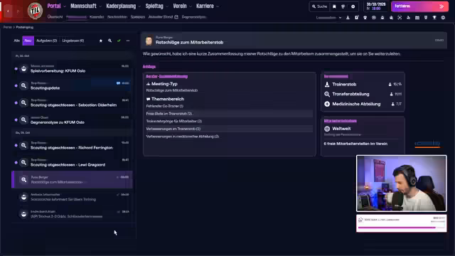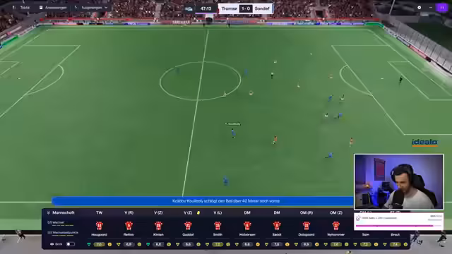 00:46:07Eine wichtige Nachricht im Chat betrifft die zukünftigen TV-Rechte der Champions League ab der Saison 2027/28. Es wird berichtet, dass Paramount+ die Topspiele am Dienstag und Amazon am Mittwoch zeigen werden, während das Finale auf Netflix zu sehen sein soll, es sei denn, ein deutsches Team erreicht es, dann wird es im Free-TV gezeigt. Diese Änderungen führen zu Diskussionen über die Fragmentierung der Übertragungsrechte und die Auswirkungen auf die Zuschauer. Währenddessen läuft das aktuelle FM-Spiel gegen Kvumm Oslo, eine Mannschaft im Abstiegskampf. Trotz einer frühen Führung durch Daniel Braut nach einem Elfmeter, der zunächst verschossen wurde, bleibt das Spiel spannend. Die Mannschaft muss sich konzentrieren, um den Sieg zu sichern und die Saisonziele zu erreichen, während die Diskussionen im Chat über Fußball und Streaming-Dienste weitergehen.
