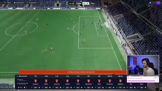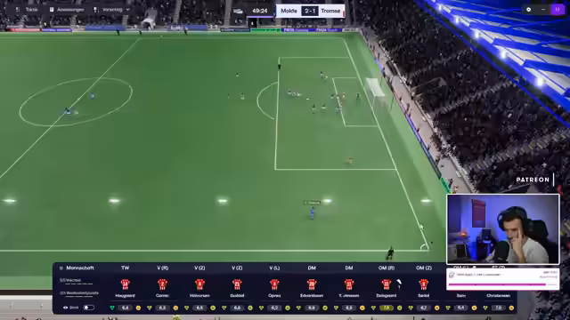 02:58:52Das Conference League Spiel gegen Dirk Schusters Mannschaft beginnt. Der Streamer kommentiert die ungewohnt große Schrift im Spiel und die veränderte Darstellung der Statistiken, die nicht wie erwartet während des Spiels eingeblendet werden können. Trotz dieser visuellen Irritationen konzentriert er sich auf das sportliche Geschehen. Es wird erwähnt, dass bisher kein norwegischer Verein in der Conference League verloren hat. Das Spiel verläuft zunächst unglücklich mit einem Eigentor, gefolgt von einem beeindruckenden Treffer der Gegner. Spieler wie Smith und Braut zeigen jedoch vielversprechende Leistungen. Der Streamer plant taktische Umstellungen in der Halbzeit, um das Spiel noch zu drehen. Die Spannung steigt, da ein Sieg in diesem Spiel wichtig wäre, um die Chancen in der Conference League zu wahren.
