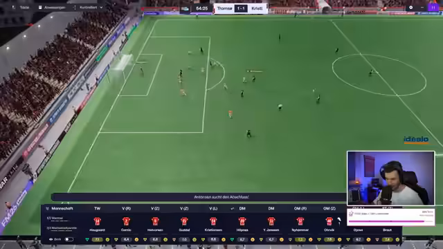 00:53:56Das Spiel endet knapp und unglücklich für Tromsø IL, das torlos in die Pause geht. Die Leistung der Mannschaft ist, insbesondere in der Offensive, als nicht zufriedenstellend zu bewerten. Der Streamer zeigt sich frustriert über eine vergebene große Chance durch Braut. Eine zusätzliche Belastung stellt die Verletzung von Spieler Wapne dar, was den Kader für die zweite Hälfte weiter dezimiert. Trotz des knappen Ergebnisses wird das Spiel fortgesetzt, und der Streamer betont die Bedeutung, in der zweiten Halbzeit keine weiteren Gegentore zu kassieren. Das Spiel bleibt bis zum Ende auf Messers Schneide.