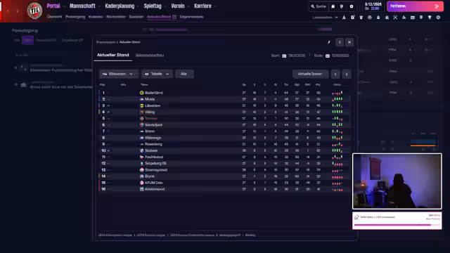 03:37:26Der Streamer startet in das letzte Ligaspiel der Saison gegen Lillestrøm. Ein Sieg ist nötig, um noch auf den dritten Platz und damit in die internationale Wettbewerbe vorzustoßen. Die Konkurrenzverhältnisse sind spannend, da zeitgleich die Meisterschaft entschieden wird. Molde führt gegen Bodø/Glimt, was Druck auf die eigene Situation ausübt. Das Spiel verläuft zunächst zäh, und es werden taktische Umstellungen vorgenommen, um mehr Offensive zu erzeugen. Trotz einer Umstellung und intensiver Bemühungen gelingt es der Mannschaft nicht, ein Tor zu erzielen.