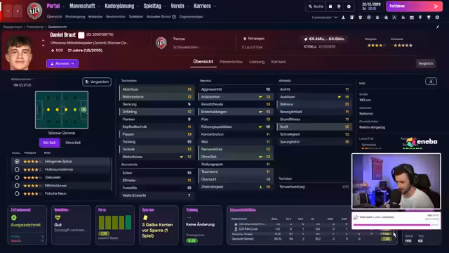 00:20:48Der Streamer gibt einen Überblick über den aktuellen Stand der zweiten Saison in Norwegen. Das Team befindet sich am Ende der Saison und liegt auf Platz 2, wobei die Meisterschaft zwischen Molde und Bode Glimp entschieden wird. Es stehen noch fünf Ligaspiele aus, und die Tabelle ist im Mittelfeld sehr eng. Der Streamer plant, die Liga-Spiele heute Abend zu Ende zu bringen, um die Saison abzuschließen. Zudem wird ein neuer Transfer bekannt gegeben: Carsten Ekornes, ein 20-jähriger norwegischer Innenverteidiger, wurde für vier Millionen Euro verpflichtet. Er ist der neue Topverdiener des Teams und gilt als vielversprechendes Talent, das das Team in der Defensive verstärken soll. Dieser Transfer ist auch ein Vorgriff auf mögliche Abgänge von Leistungsträgern in der Zukunft, wie Tobias Goodall und Abu Bakar Sediq Hintje.