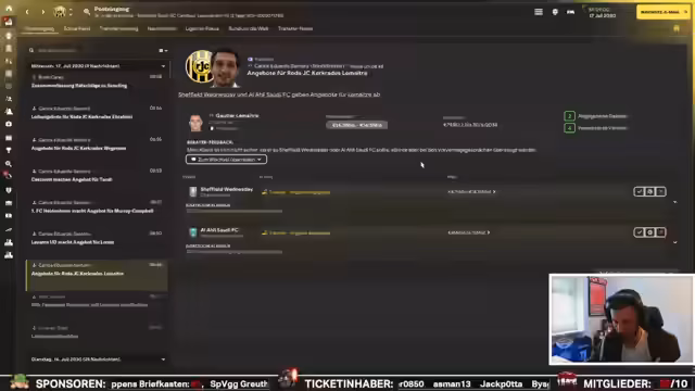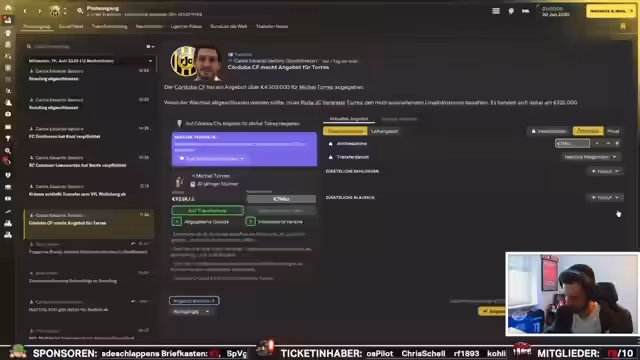 03:03:48Der Streamer äußert seine Sorge über die aktuelle finanzielle Situation und den fehlenden Budget für Transfers. Er betont, dass es ihm nicht gelingt, Spieler zu verkaufen und drängt auf schnellstmögliche Abschlüsse. Der Transfer von Robles für 18 Millionen Euro ist ein wichtiger Schritt, um die Liquidität zu verbessern. Gleichzeitig fehlt ein Torhüter und es besteht das Ziel, sich für die Champions League zu qualifizieren, um das Budget weiter aufzustocken. Der Versuch, einen Stürmer namens Storch zu holen, gestaltet sich schwierig.