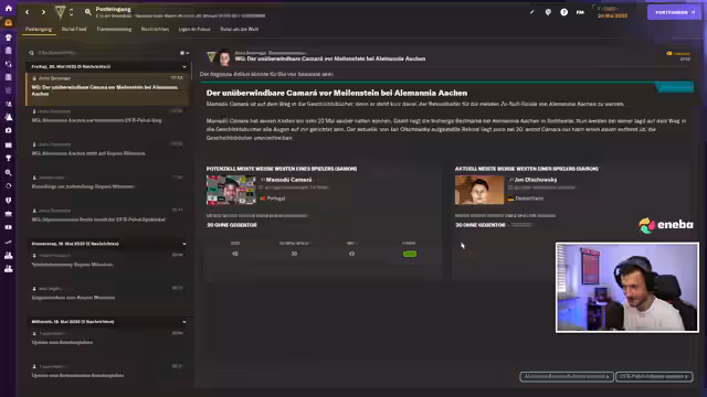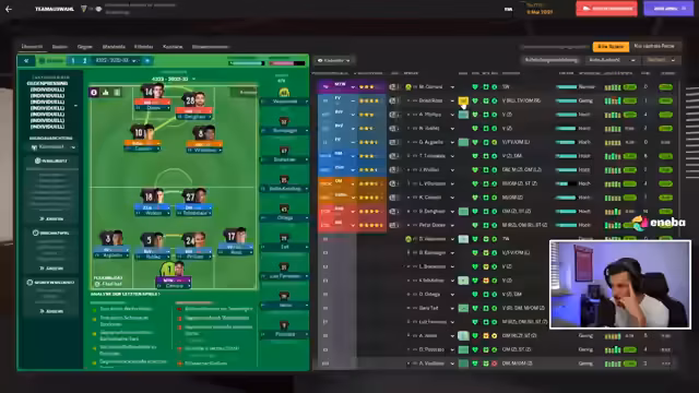01:12:23Der Streamer präsentiert den aktuellen Stand im Football Manager. Der Verein steht auf dem zweiten Platz der Bundesliga, einen Punkt hinter dem FC Bayern, bei noch zwei ausstehenden Spielen. In internationalen Wettbewerben ist die Mannschaft ins Halbfinale der UEFA Europa Conference League gegen Samsun Spor eingezogen und steht im DFB-Pokalfinale gegen den FC Bayern. Anschließend gibt es Ankündigungen zum eigenen Fanradio, in dem die Community einen Begriff für den Abend wählen darf, um ihn dort einzubauen.