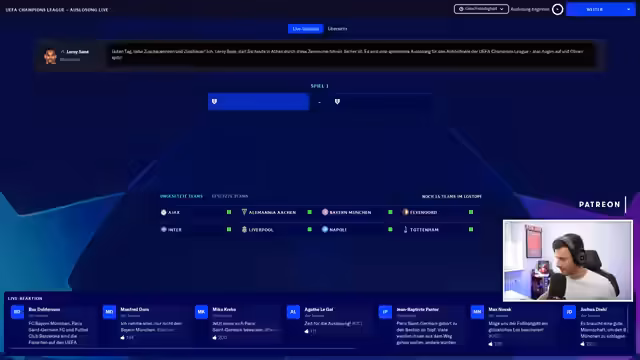 01:37:50Der Streamer beschreibt die Aufregung und den Nervenkitzel während der Auslosung des Champions League-Viertelfinals. Nachdem er zunächst hofft, einen vermeintlich einfachen Gegner zu bekommen, fallen mit Arsenal, Chelsea, Inter Mailand, Atletico Madrid, Manchester City und PSG starke Teams heraus. Seine persönlijke Abneigung gegen Wolfsburg wird deutlich, da er ein Spiel gegen sie als eklig empfindet. Er erwartet, dass Dortmund und Gladbach in der Bundesliga nachlegen und analysiert die anstehenden Ligaspiele.
