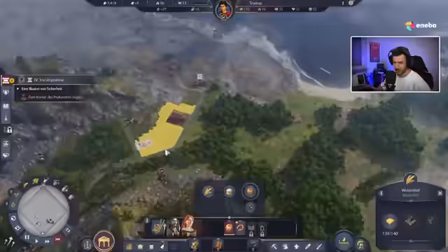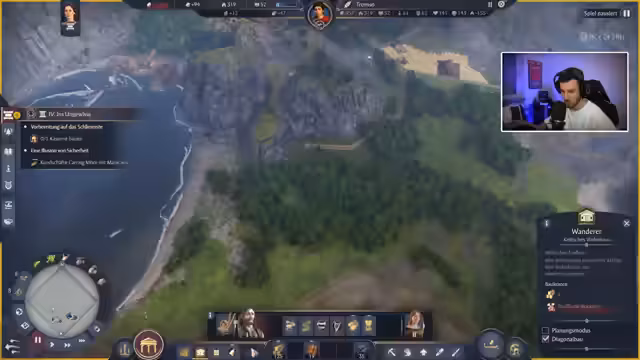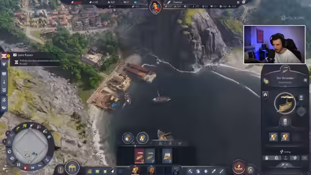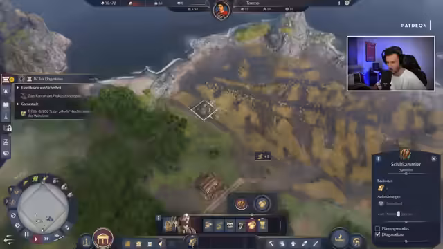 01:35:59Der Streamer beginnt mit der Bergung eines Wracks, in der Hoffnung auf wertvolle Kohle. Kurz darauf erhält er einen Brief aus Latium, der von seinem Prokurator gelesen wurde und auf mögliche ungehörige Verhaltensweisen von Regierungsbeamten hinweist. Währenddessen plant der Streamer den Bau einer neuen Siedlung, um die Ästhetik der Insel zu verbessern und die Arbeitskraft zu erhöhen. Er muss jedoch feststellen, dass ein Teil der Insel blockiert ist. Die kritische Versorgung und der Mangel an Geld stellen erste Herausforderungen dar. Ein Brief von Markus Naucratius offenbart weitere politische Verwicklungen und die Notwendigkeit, eine Kaserne zu bauen, wobei der Standort strategisch gewählt werden muss, idealerweise in der Nähe des Hafens.