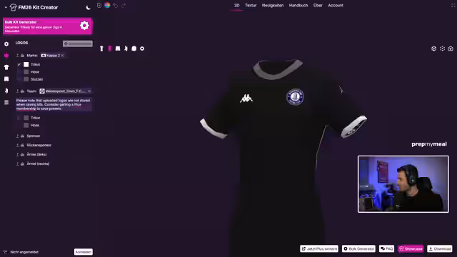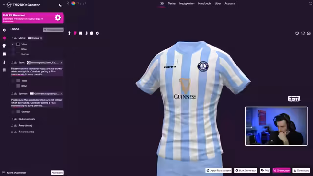 00:20:10Nach der Vorstellung des Spiels wendet sich der Streamer der Erstellung der Trikots zu. Er nutzt das FM-Kid Creator Tool, um die Heimtrikots von Warren Point Town zu designen. Es folgt eine detaillierte Diskussion über Farben, Logos und Sponsoren. Dabei wird das Kappa-Logo als Ausrüster ausgewählt, der Sponsor 'Guinness' eingefügt und über die Farbgestaltung (blau-weiß gestreift) debattiert. Der Streamer ist begeistert von den Möglichkeiten und experimentiert mit verschiedenen Designs.