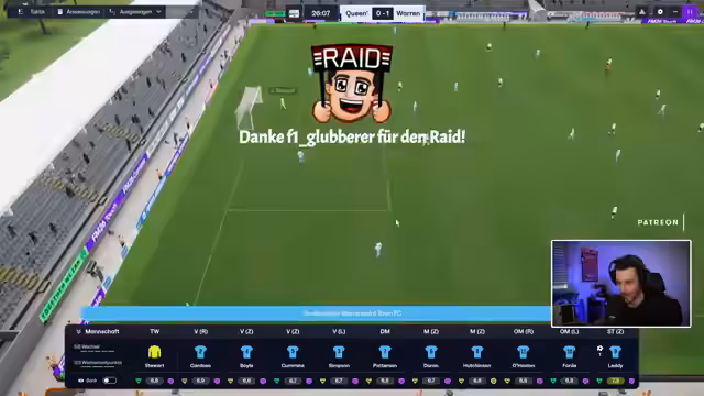 01:22:20Der Streamer schaltet in das Live-Spiel von Warren Point Town gegen Queen's University Belfast. Das Spiel verläuft überwiegend nach Wunsch: Bereits in der 40. Minute geht man durch Tore von O'Hanlon und Leddy mit 2:0 in Führung. Im weiteren Spielverlauf wird der Sieg klar dominiert und das Spiel endet mit einem verdienten 4:0-Erfolg. Dies markiert den ersten Saisonsieg für den neu übernommenen Verein und sichtbarlich für den Streamer und den Chat.