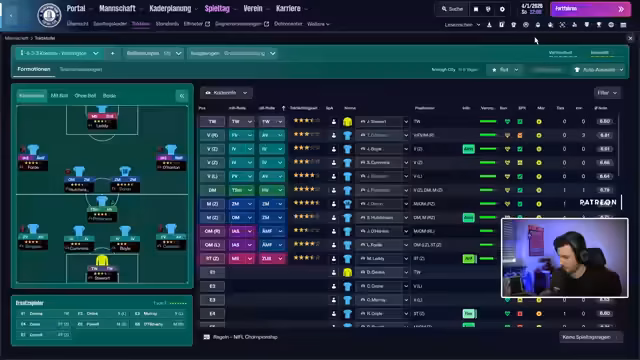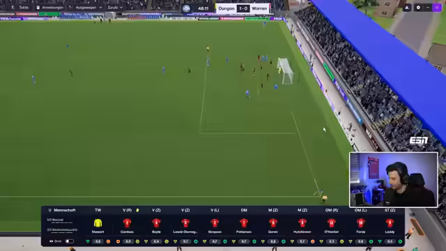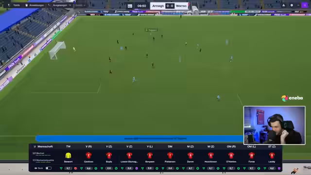01:49:22Das Team startet in den neuen Rot-Schwarzen Trikots in die Partie, nachdem zuvor in Blau-Weiß gespielt wurde. Die Ballbesitzquote wird beobachtet, wobei bemerkt wird, dass die Formation ballbesitzorientiert ist, jedoch Probleme mit der Defensivabsicherung hat. Die Verbindungen zu Scouting-Abteilungen werden kritisch hinterfragt.