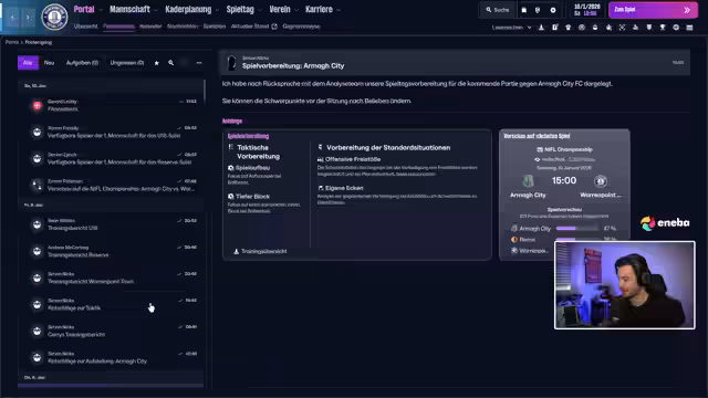 00:17:04Der Streamer stellt den neuen Football-Manager-Save vor, in dem er die Leitung des Vereins Warren Point Town FC in der zweiten nordirischen Liga übernommen hat. Er erklärt die Ausgangslage: Als Tabellenletzter gestartet, hat man bisher nur vier Unentschieden und eine Niederlage erreicht, mit einem vier Punkte Rückstand auf den elften Platz. Das Ziel ist der erste Saisonsieg im bevorstehenden Spiel gegen Queen's University Belfast.