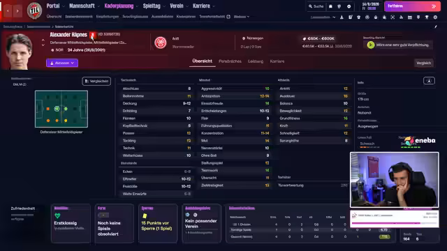 02:38:23Die Suche nach Verstärkungen für das Team, insbesondere im defensiven Mittelfeld, wird fortgesetzt. Es werden Spielerdatenbanken durchsucht, wobei der Fokus auf gescouteten Spielern aus Nordeuropa liegt. Namen wie Nikolas Nartei und Venänen werden diskutiert. Die Schwierigkeit, einen geeigneten Sechser zu finden, der das Team verstärken kann, wird betont. Es wird überlegt, ob ein 18-jähriger Norweger für 130.000, der um Freigabe gebeten hat, eine gute langfristige Investition wäre, auch wenn er nicht sofort gebraucht wird. Die begrenzte Transferperiode im August stellt eine Herausforderung dar. Es wird überlegt, ob man direkt ins Spiel gegen Trabzonspor gehen oder noch auf dem Transfermarkt aktiv werden soll. Die Registrierungsregeln für die Conference League müssen beachtet werden. Die Mannschaftsaufstellung für das Spiel gegen Fredrikstad wird besprochen, wobei einige Rotationen vorgenommen werden müssen, da die Spieler müde sind.
