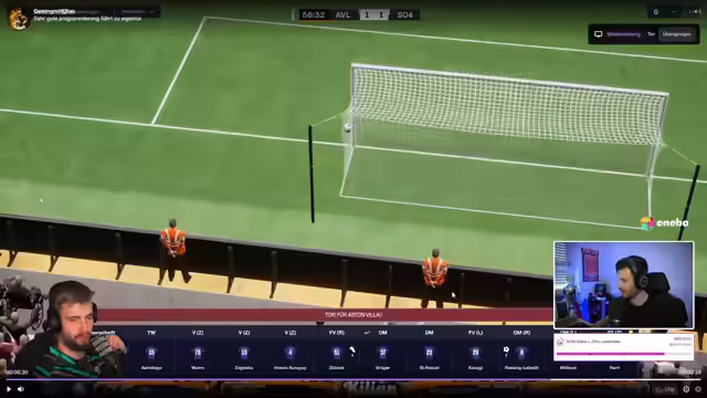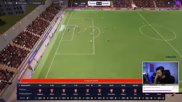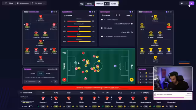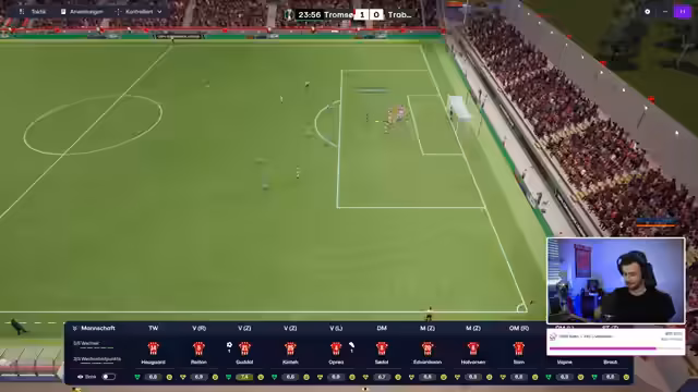 01:34:40Das Spiel gegen den Tabellenzweiten Lillestrøm beginnt, und Tromsø kann den Schwung aus der Europa League Qualifikation mitnehmen. Ein frühes Tor durch Oprea bringt Tromsø in Führung, was die Zuschauer begeistert. Trotz eines zwischenzeitlichen Ausgleichs durch Lillestrøm, erzielt Söderl ein spektakuläres Freistoßtor, das Tromsø wieder in Führung bringt. Eine neue Wette für das Europa League Rückspiel wird gestartet, bei der die Zuschauer ihre Schlappis setzen können. Der Streamer äußert den Wunsch, dass alle außer seinen bevorzugten Spielern ihre Schlappis verlieren. Das Spiel gegen Lillestrøm entwickelt sich zu einem spannenden Schlagabtausch, mit vielen Chancen auf beiden Seiten. Tromsø zeigt weiterhin eine starke Leistung und kämpft um jeden Ball.