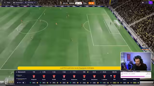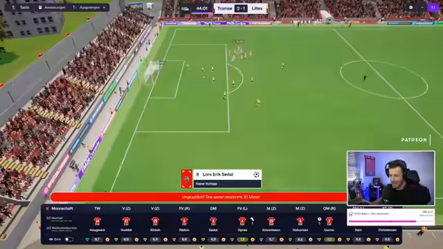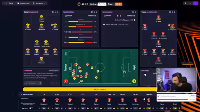 00:30:12Das erste internationale Pflichtspiel in der dritten Qualifikationsrunde der Europa League gegen Union Saint-Gilloise beginnt. Union Saint-Gilloise wird als Favorit eingeschätzt, aber Tromsø zeigt sich kämpferisch. Nach einem frühen Rückstand durch einen Elfmeter, dreht Tromsø das Spiel innerhalb von fünf Minuten und führt zur Halbzeit. Die Mannschaft zeigt eine starke Leistung, insbesondere in der Offensive, und erarbeitet sich viele Torchancen. Trotz einer Verletzung eines Spielers und einiger technischer Probleme, wie einem Sound-Bug, bleibt die Stimmung im Stream positiv und die Zuschauer fiebern mit. Der Streamer betont, dass ein Sieg in diesem Hinspiel eine hervorragende Ausgangsposition für das Rückspiel in Belgien wäre und die internationale Teilnahme sichern würde.