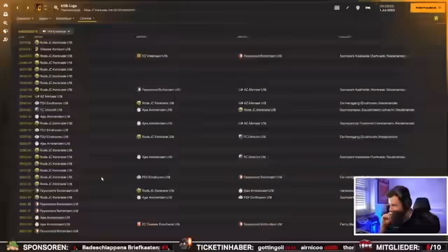 02:01:06Der Streamer blickt in die Zukunft des Fußballs und skizziert die Entwicklung bekannter Vereine. Duisburg und Bielefeld existieren demnach nicht mehr, wobei Arminia Bielefort stattdessen in der dritten Liga verweilt und sich nur selten in höhere Ligen kämpfen konnte. Beim eigenen Klub, Roda Kerkrade, wird im Max-Morlock-Stadion gespielt. Der Trainerstab wechselte häufig, darunter Namen wie Horst Steffen, Bo Svensson und Jörg Schmadtke, der den Verein zum Zweitligameister führte.
