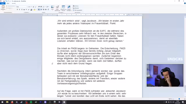 00:16:57Nach einem kurzen Smalltalk über den Vergleich zwischen Beamten und Streamern diskutiert der Streamer aktuelle Fußball-Nachrichten. Er spricht über die Champions-League-Auslosung und den spektakulären Transfer von Nick Woltemade zu Newcastle für 85 Millionen Euro. Anschließend widmet er sich einem übersetzten Interview von Miles Jacobson, dem Chefentwickler von Sports Interactive. Dieses Interview beleuchtet die Gründe für die Absage von Football Manager 25 und die Herausforderungen bei der Entwicklung, insbesondere die schwierige Umstellung auf die neue Spiel-Engine Unity.
